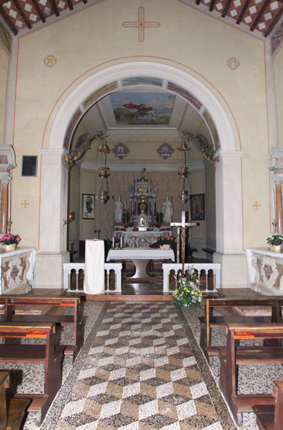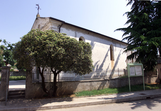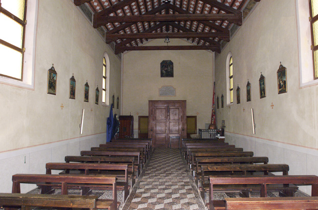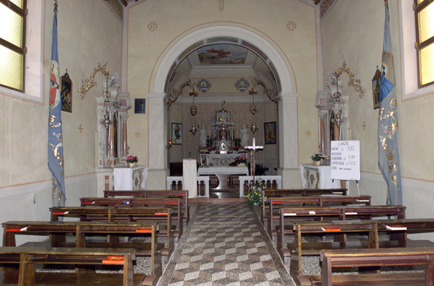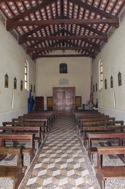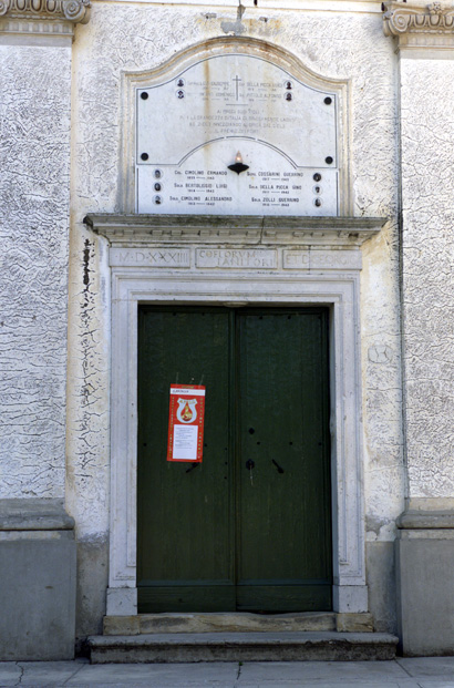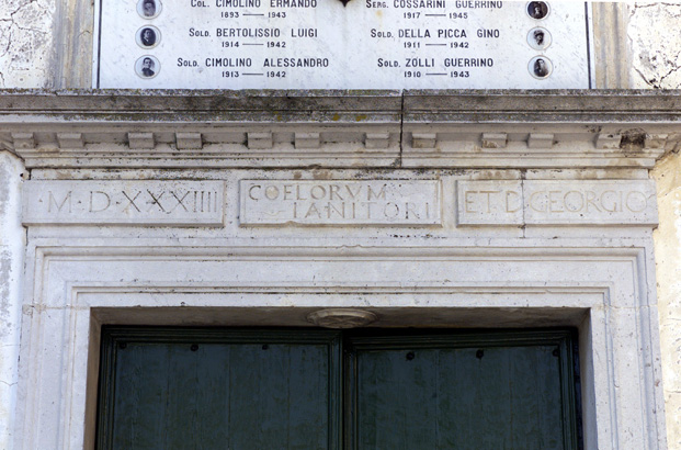 aula: DEO/ O. M., ET. D. MARTY:/ GEORGIO/ HOC TEMPLVM DICATVM EST, CONSECRATVM VERO/ A. R:mo IN XTO P. BERTRANDO DEI GRATIA/ PATRIARCHA AQVILEIENSIS AN: DOMINI/ MCCCIL; DIE XXVII SEPTEMBRIS QUI IUSSIT/ SINGVLIS ANNIS ANNIVERSARIVM DEDICATIONIS/ CELEBRARI DOMINICA VLTIMA SEPTEMBRIS