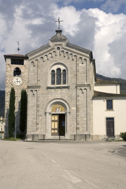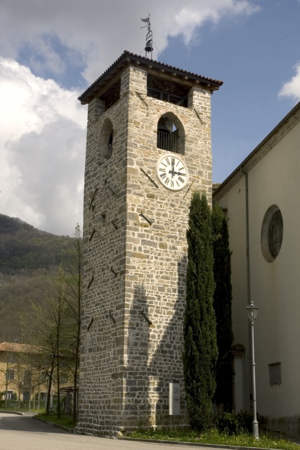 tipologia a torre isolata; fusto a corpo unico a pianta quadrata (muratura in pietra a vista), con feritoie e iscrizione su lastra di pietra; cella campanaria inglobata nel fusto (pianta quadrata), su ogni lato monofore ad arco a sesto acuto e soprastanti ampie aperture; sommità formata da copertura a quattro falde inclinate (manto in coppi di laterizio); elemento apicale costituito da campanello, croce e bandiera segnavento su supporto in metallo