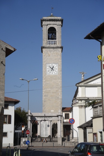 tipologia a torre isolata; basamento a corpo unico con pianta quadrata (muratura in pietra a vista), con porta d'ingresso; fusto a corpo unico con pianta quadrata (muratura in pietra a vista), con feritoie e quadrante di orologio (cifre romane, quattro:IV); cella campanaria a pianta quadrata con monofore ad arco a tutto sesto (muratura in pietra bugnata a vista); sommità formata da copertura a quattro falde inclinate (manto in lamiera); elemento apicale costituito da croce e bandiera metalliche