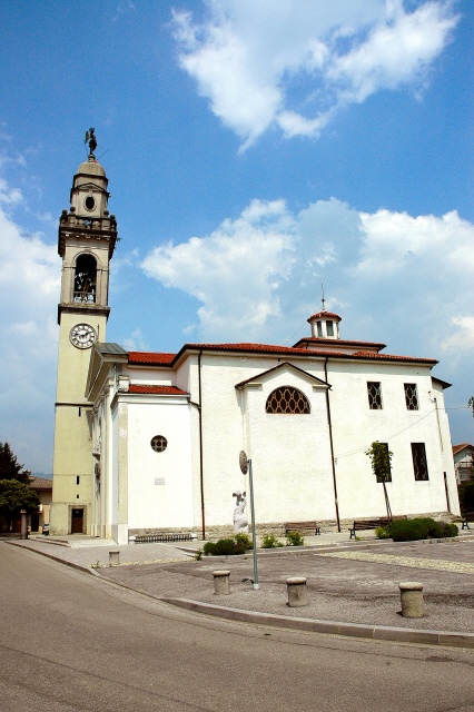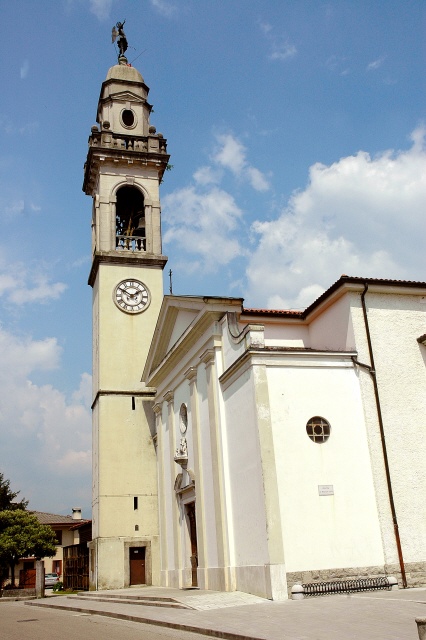tipologia a torre isolata; basamento a corpo unico con pianta quadrata (muratura intonacata); fusto a corpo unico con pianta quadrata (muratura intonacata), con feritoie, cornice di demarcazione orizzontale e quadranti di orologio (cifre romane, quattro: IIII); cella campanaria a pianta quadrata con monofore ad arco a tutto sesto (muratura intonacata); sommità formata da copertura a pianta quadrata con otto falde curvilinee su lanterna a pianta ottagonale (manto in calcestruzzo, muratura della lanterna intonacata); elemento apicale costituito da statua di angelo metallica