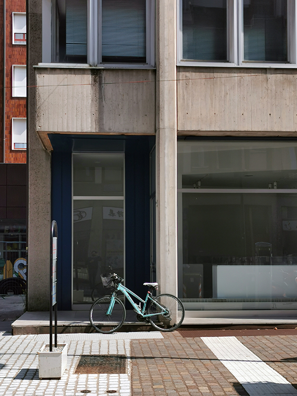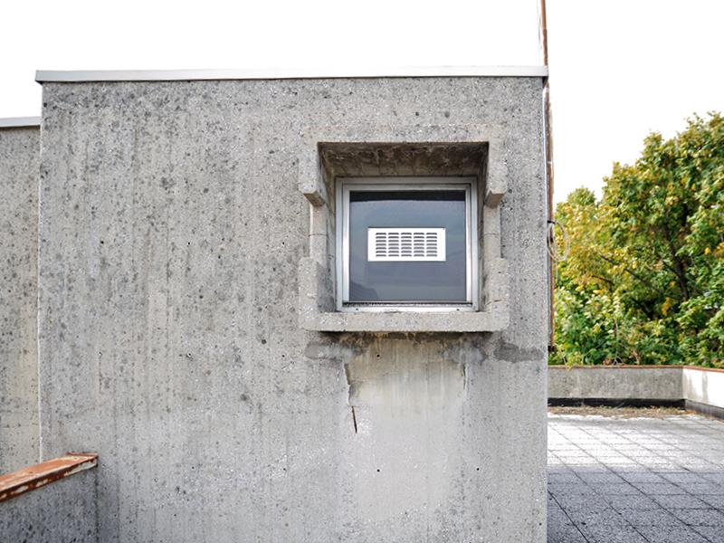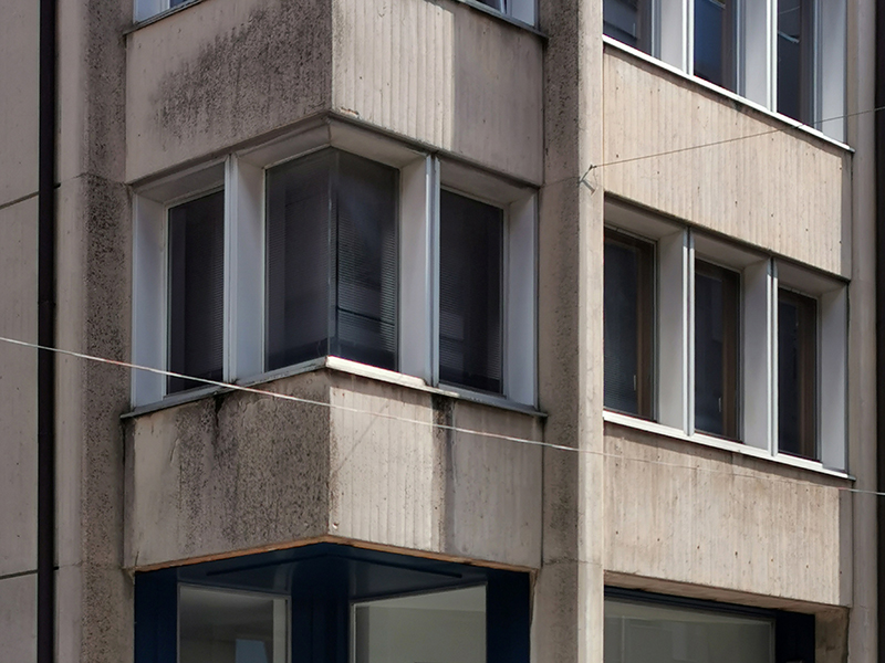 La struttura portante in calcestruzzo armato a vista è facilmente individuabile anche in facciata, sia nei pilastri verticali che salgono sino allo sporto di linda sia nelle pareti cieche che riportano in orizzontale l’intradosso di ogni solaio.