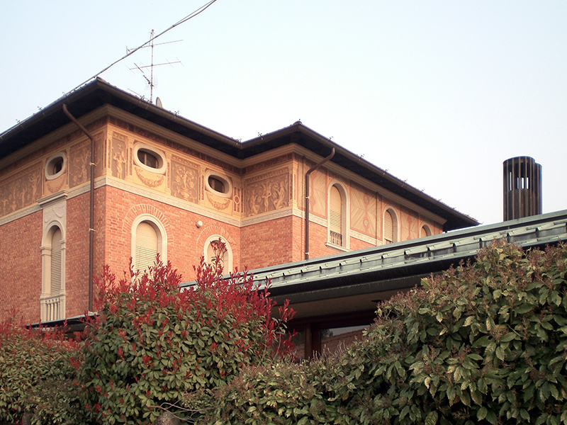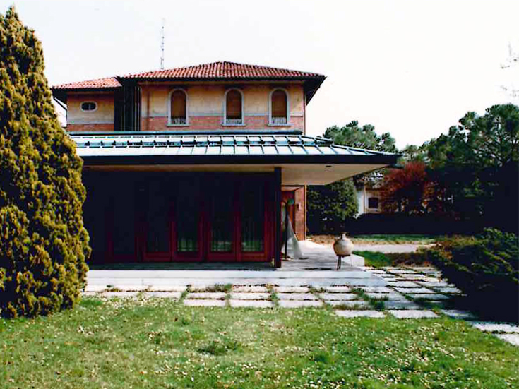 Il nuovo edificio raddoppiò la superficie coperta con altri 150 metri quadri, ma si sviluppò solo al piano terra e al piano interrato per non sottrarre spazio alla facciata esistente. L’ampliamento si rapporta con la preesistenza e si aggrega ad essa dal retro per svilupparsi a «U», creando una sorta di patio verso il giardino interno. La continuità è garantita dall’uso dei materiali, ad eccezione dell’utilizzo del rame in copertura. L’annesso si sviluppa partendo dal retro del corpo esistente. Nel vecchio edificio rimangono le camere e al piano terra gli spazi lavorativi, mentre la nuova porzione assume un carattere più privato. La pianta sembra generata dalla centralità del camino e del patio, intorno ai quali si dispiega il percorso che attraversa la cucina, la sala da pranzo e il soggiorno. La struttura portante è in mattoni a vista, in continuità con l’esistente. Le fondazioni sono in calcestruzzo armato, mentre i solai sono realizzati in laterocemento. I pavimenti interni sono prevalentemente in marmo, i serramenti in legno Douglas e la copertura in rame.