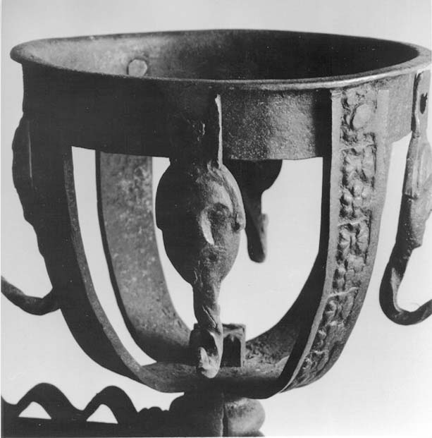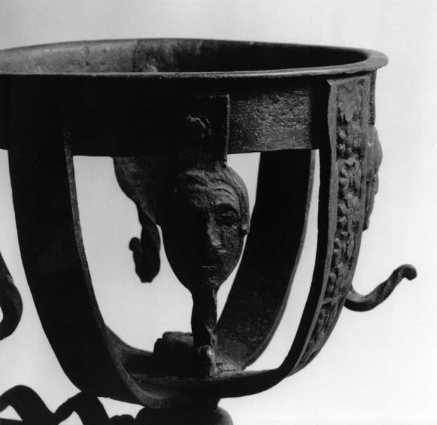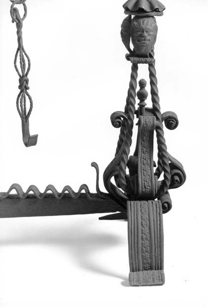 Alare doppio con bracci mobili e cestelli. I piedi si sviluppano in ampie volute con decorazione incisa e punzonata della superficie. La sbarra orizzontale si appiattisce e si allunga piegandosi dando forma a brevi spirali, con la superficie visibile decorata dallo lo stesso motivo dei piedi. Sulla sbarra si allungano per un breve tratto due coppie di nastri ondulati fissati mediante ribattini. I montanti verticali si inseriscono direttamente sulla sbarra e presentano un elaborato elemento decorativo iniziale terminante con quattro maschere zoomorfe sormontate da un anello ritorto e da un piattello ondulato che concluede la composizione. Dai mascheroni in poi si sviluppano i veri e propri montanti verticali. I bracci mobili sono caratterizzati da motivi decorativi nastriformi applicati superiormente e inferiormente alle barrette, e fissati per mezzo di fascette terminali sagomate. Ogni braccio mobile è dotato, al suo apice, di un anello per accogliere le catenelle e di un gancio.