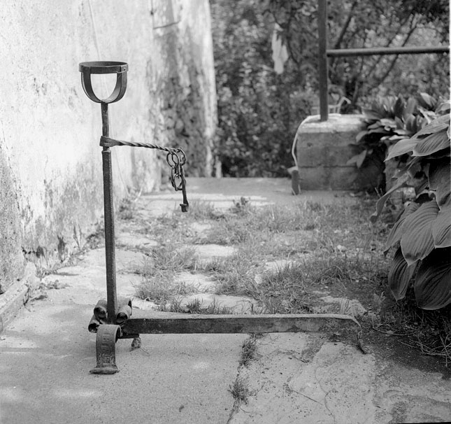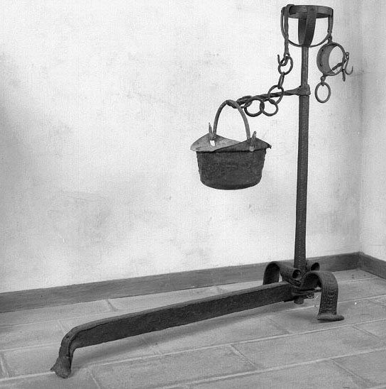 semi alare con tre piedini, una barra traversale e un montante che termina in alto in una specie di calice a giorno. Il montante è munito di un brac cio mobile sporgente, lavorato a torciglione, alla cui estremità pendono d egli anelli a un gancio. All'incrocio del montante e della barra trasversa le sono applicati alcuni riccioli in ferro battuto.