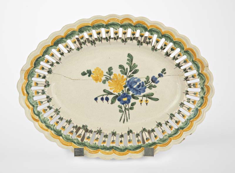 Piatto ovale di maiolica bianca con tesa traforata e sagomata a cappe e doppia profilatura in rilievo. Sul fondo mazzetto di fiori gialli e azzurri con foglie verdi. Nella parte a giorno sono dipinti tanti minuscoli fiorellini. Sul bordo strisce di colore giallo e verde. Sul verso è presente la marca di fabbrica PB di colore viola scuro.