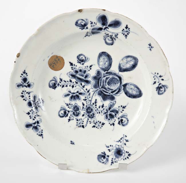 Fondina di porcellana color avorio con tesa sagomata. Decorazione floreale color blu inchiostro: fiori sparsi sulla tesa e mazzo di fiori di diverso tipo e foglie al centro. Sul verso è presente la marca di fabbrica nello stesso colore blu della decorazione