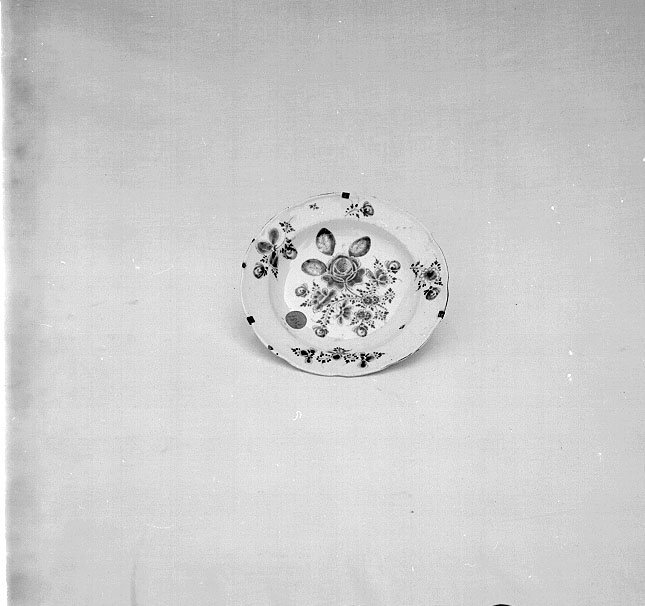 La fabbrica di porcellana dura di Vienna fu fondata nel 1717 da Claudio Innocenzo du Paquier, ufficiale di corte di origine fiamminga. Nel 1744 egli cedette la manifattura all'imperatrice Maria Teresa e ne rimase il direttore. La fabbrica, dopo alterne vicende, chiuse definitivamente nel 1864. Nel periodo Du Paquier non veniva usata alcuna marca di fabbrica, in seguito fu adottato uno scudo, impresso o dipinto, con una doppia riga trasversale al centro. Dal 1785 in avanti furono aggiunte le ultime due cifre della data. Il piatto deve essere posteriore al 1744 poiché porta la marca di fabbrica, ma nella decorazione è molto vicino alla produzione del Du Paquier, che è "di qualità assai elevata: nei servizi ricorda le forme dell'argenteria; la decorazione è varia, con intrecci, fiori orientali, fiori europei, palmette, cartigli, monocromi in nero o rosso, o di un caratteri stico color rosa-violaceo e argento"(Rosa1966, p. 29; cfr. piatto scheda 6200).