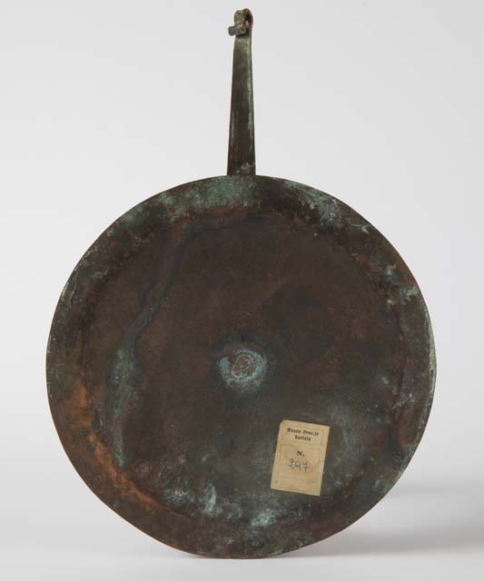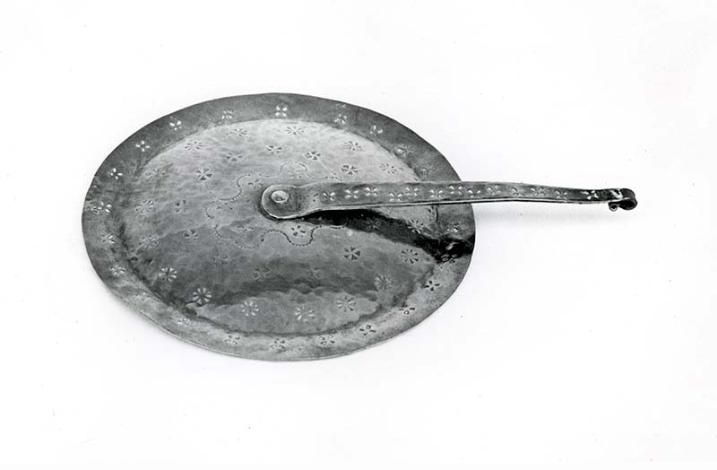 Coperchio a calotta quasi piatta con stretta tesa piana. Su tutta la superficie decorazione impressa a stampo, costituita, partendo dal centro, da alcuni fiorellini geometrizzati a quattro petali (che si ripetono anche sulla tesa e sul manico), da una serpentina irregolare formata da archetti dentellati, e da due cerchi concentrici di rotelline a cinque e a otto raggi. Il lungo manico piatto è applicato al centro del coperchio e termina a ricciolo.