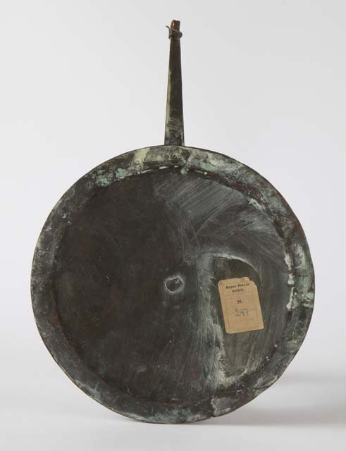 Coperchio a calotta quasi piatta, con stretta tesa piana, decorato a stampo su tutta la superficie con un motivo di fiorellini stilizzati alternati ad archetti dentellati, affrontati o a serpentina. Il manico, luno e piatto, è fissato al centro del coperchio con un chiodo. Termina con un ricciolo schiacciato ed è decorato con un motivo di rotelline a otto raggi.