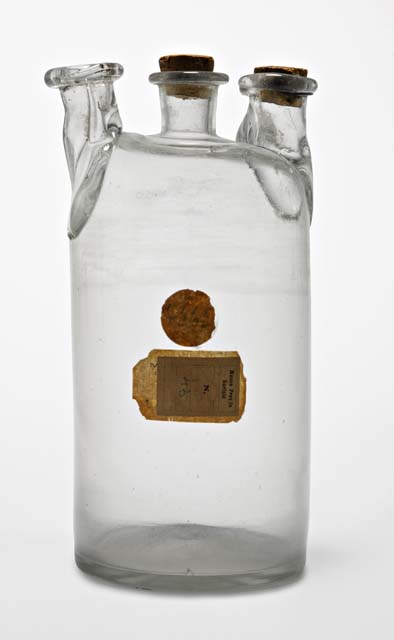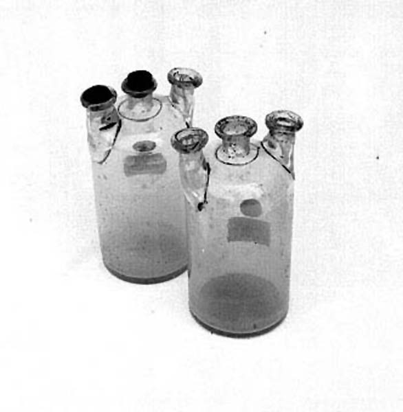 Coppia di bottiglie in vetro soffiato, di eguali dimensioni e di forma cilindrica. Entrambe presentano tre imboccature allineate, con collo corto, tozzo e grosso bordo estroflesso.