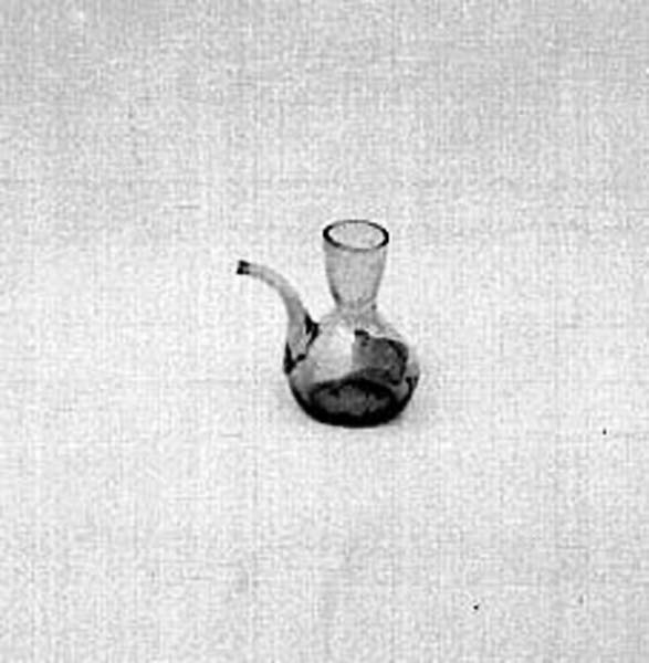 Bottiglietta di vetro soffiato verde oliva pallido, con corpo panciuto, base rientrante, alto collo a forma di tronco di cono e lungo beccuccio sottile e ricurvo.