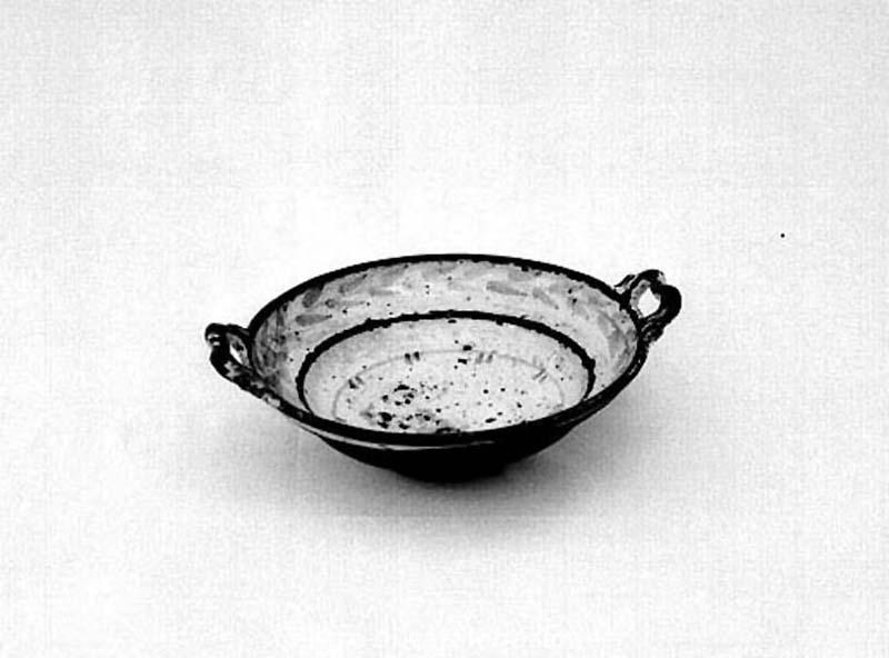 Terrina biansata di terracotta con stretta base rialzata e tesa concava. L'interno della terrina e smaltato in colore bianco avorio con decorazione in azzurro e ghirlanda di foglioline sulla tesa e fiore centrale sul fondo.