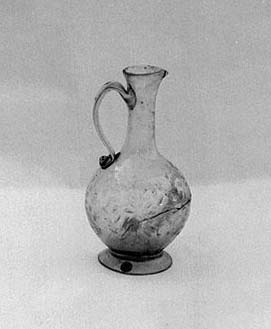 Brocca di vetro incolore, panciuta nella parte inferiore (a sezione ovale), decorata a mola con di fiori e corone di foglie stilizzati. Dotata di lungo collo, piccolo versatoio decorato a piccoli ovuli, un piccolo versatoio e impugnatura ad ansa.