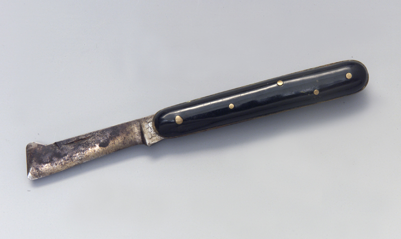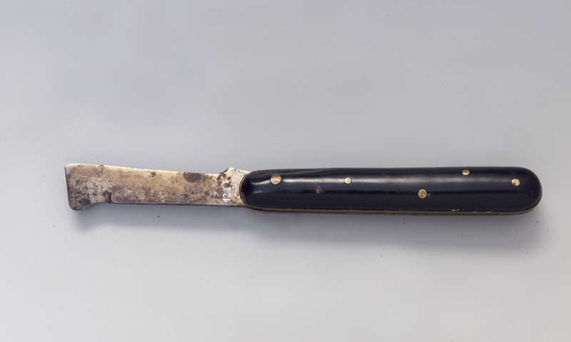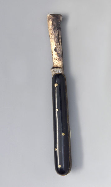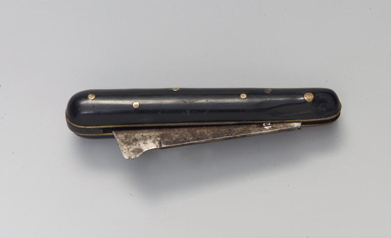 Il coltello quando chiuso presenta una forma rettangolare con i lati minori arrotondati. Dalla fenditura che ospita la lama (a coltello chiuso) questa rimane esposta per circa un terzo della sua larghezza. Le guancette sono in perloide di colore nero e sono fissate alle piastre con chiodini le cui bollette rimangono visibili. Dal lato dello spessore del manico si distinguono nettamente gli spessori della molla tra le due piastre #cartèlis# di ottone e quelli esterni delle guancette. Tutti gli spigoli delle guancette #fassete# sono arrotondati. La lama ha la costa piatta e termina sulla punta con la caratteristica arcuatura dotata di filo. La sezione è cuneiforme, il tagliente liscio.