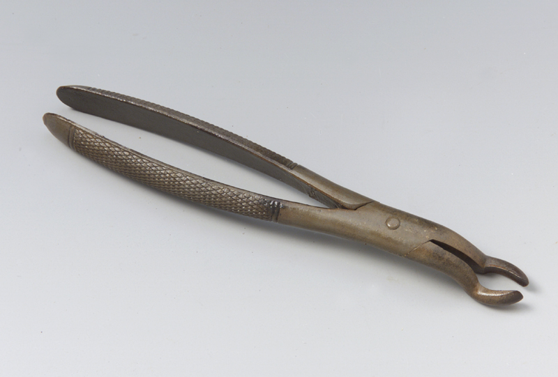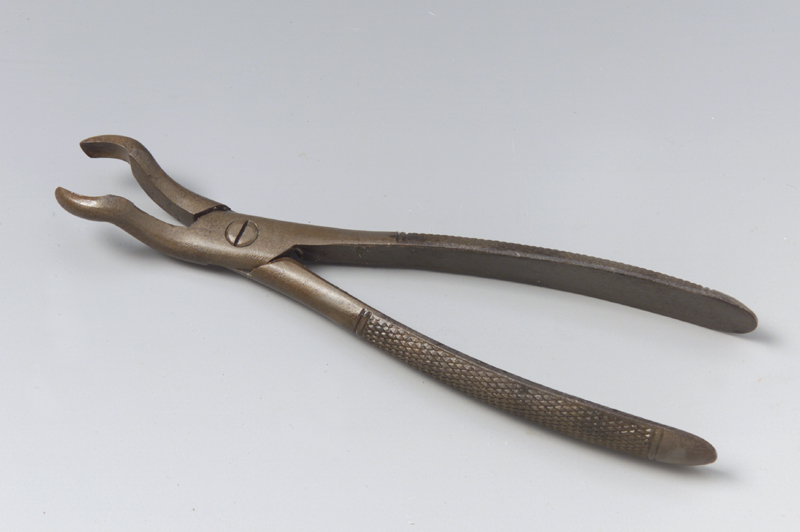 Lo strumento è costituito da due gambi imperniati a croce che si aprono e si chiudono mediante il movimento esercitato dalla mano sui gambi. Ciascuno di essi termina con un becco curvato verso il basso e terminante con due ganasce arcuate e sezione semicilindrica. I gambi sono uniti mediante vite cilindrica in vista, situata nella parte piatta e ben levigata tra ganascia e gambo. In questa parte lateralmente e all'inizio di un gambo nel metallo si notano gli incastri per la chiusura e apertura. I gambi sono inoltre leggermente arcuati, convergono nell'ultimo tratto in prossimità del calcagno dove aumentano la loro larghezza. Hanno un profilo arrotondato e recante zigrinatura antiscivolo fatta di linee oblique incrociate e segna terminante da entrambe le parti rispettivamente con due linee parallele incise, perpendicolari all'asse longitudinale dei gambi. In uno dei due calcagni, che sono arrotondati, si legge l'iscrizione. I due becchi anche se chiusi non si toccano.