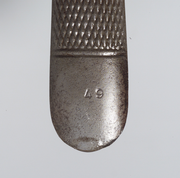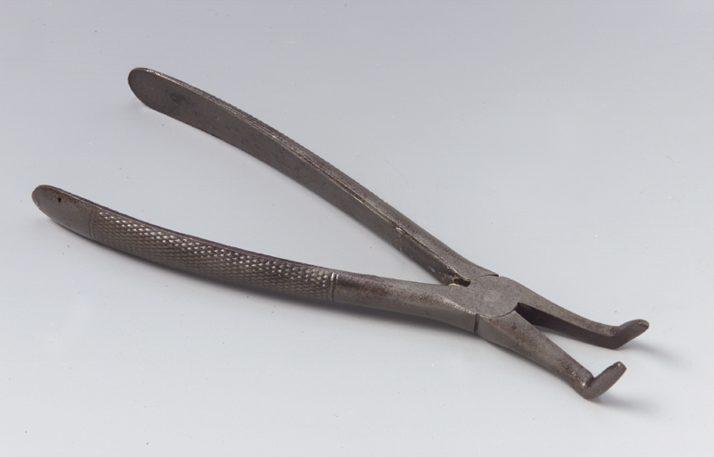 Lo strumento è costituito da due gambi imperniati a croce che si aprono e si chiudono mediante il movimento esercitato dalla mano sui gambi.Ciascuno di essi termina con un becco allungato a sezione semicilindrica, terminante con due ganasce convergenti a punta arrotondata, perpendicolari al piano del manico.I gambi sono uniti con vite cilindrica in vista, situata nella parte piatta e levigata tra ganascia e gambo. In questa parte lateralmente e all'inizio del gambo si notano gli incastri per la chiusura e apertura. I gambi sono leggermente arcuati, convergono nell'ultimo tratto in prossimità del calcagno dove aumentano la larghezza. Hanno profilo arrotondato e recano zigrinatura antiscivolo fatta di linee oblique incrociate e segna terminante da entrambe le parti rispettivamente con due linee parallele incise, perpendicolari all'asse longitudinale dei gambi.In uno dei due calcagni, che sono arrotondati, si legge l'iscrizione. Tra i becchi vi è una fessura più larga nella parte finale