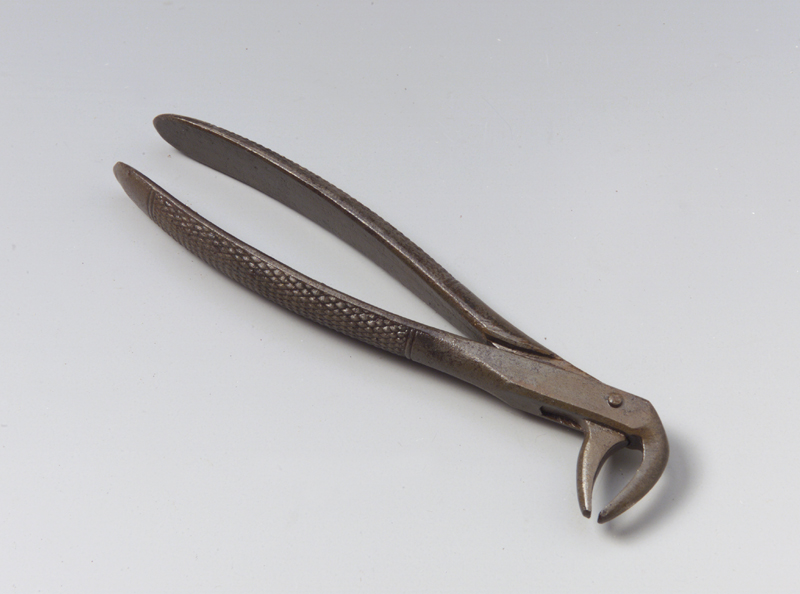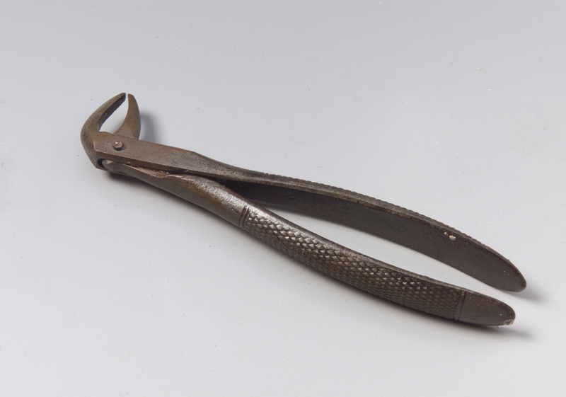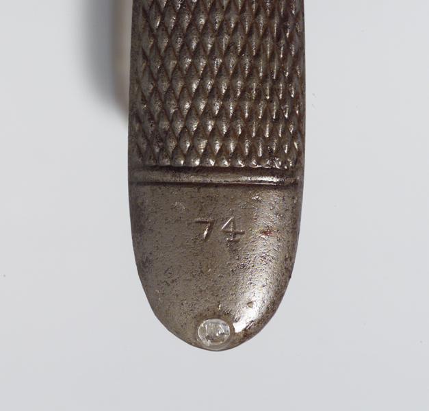 Si tratta della pinza modello 74 che si compone di due parti costituite da un becco (ganascia) e da un gambo ciascuna, assemblate a croce mediante un perno, situato nell'imposta ganasce-gambi (che presenta anche gli incastri utili all'apertura e alla chiusura delle pinze) e del quale si notano le estremità ribattute. I gambi, leggermente arcuati, convergono nell'ultimo tratto in prossimità del calcagno dove aumentano la loro larghezza. La faccia esterna di uno dei due gambi presenta inciso il numero del modello. I gambi hanno la faccia esterna arrotondata e munita di zigrinatura anti scivolo costituita da una serie di linee incise ed incrociate e racchiusa tra altre due linee incise parallele tra loro e perpendicolari all'asse longitudinale dei gambi stessi. Le ganasce a becco presentano la faccia interna piatta, rastremano in punta dove si sfiorano, hanno il lato esterno arrotondato e sono piegate a 90° da un lato.