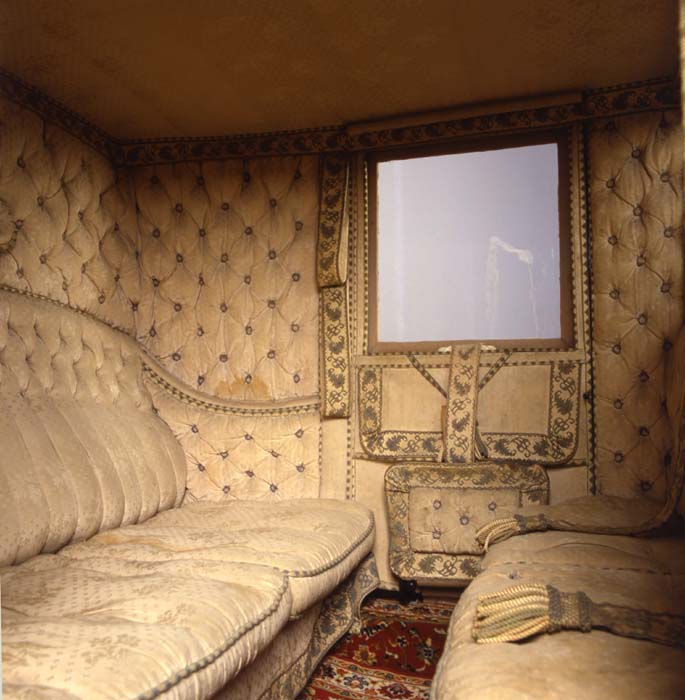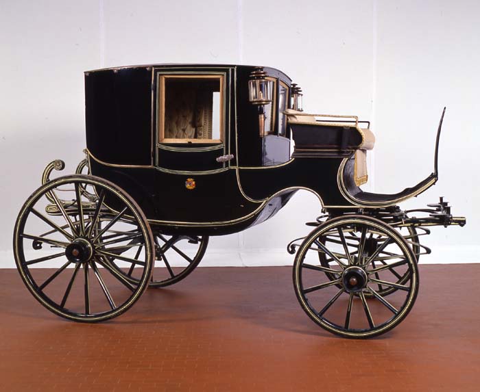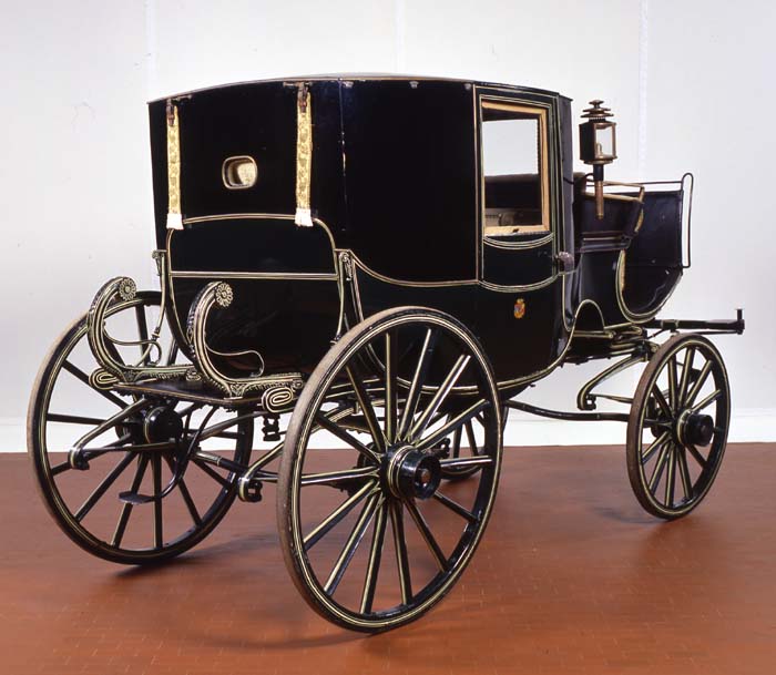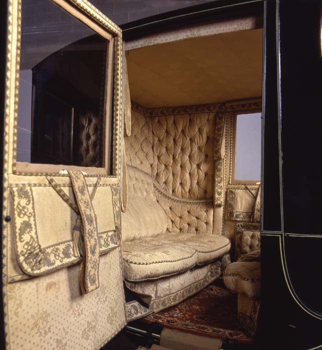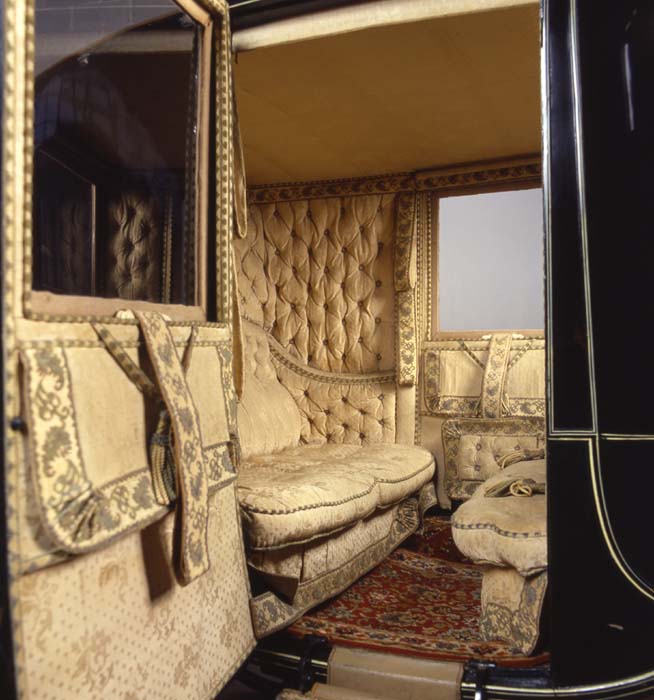 Berlina da viaggio, Italia, Rossi Torino 1830. Cassa chiusa a tre luci con due porte di accesso e vetri mobili. Due montatoi di salita pieghevoli a libro. Tapezzeria in tessuto damascato di lana e seta color avorio, cilindri avvolgibili a molla per le tende non pervenute. Ottimo stato di conservazione della tapezzeria originaria. Porte con maniglie originarie in argento e blasone della famiglia nobiliare di appartenenza. Palchetto posteriore per palafreniere e fasce in cuoio e tessuto sulla cassa per per la presa del palafreniere. Sospensioni a quattro molle ellittiche, ruoto cerchiate in ferro. Iscrizione del carrozziere sulle balestre e sui mozzi. Persone trasportate: 4. Colori: verde scuro nero e filettata. Tiro: pariglia e a quattro cavalli.