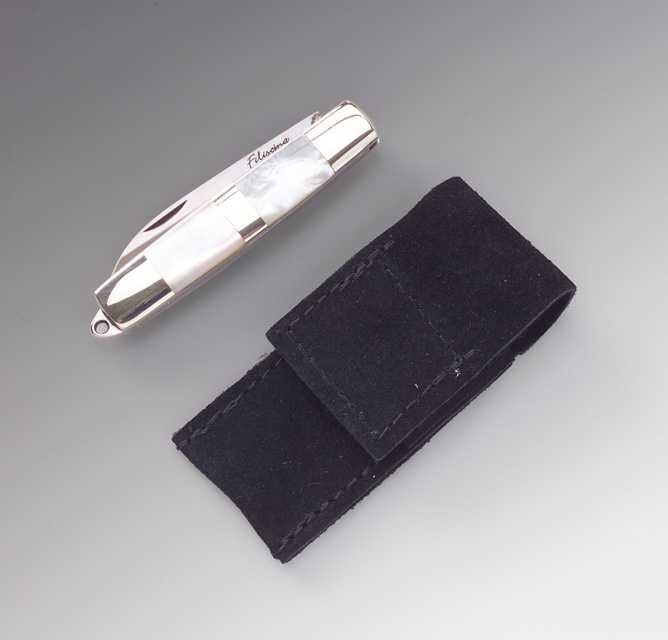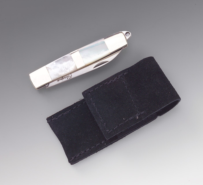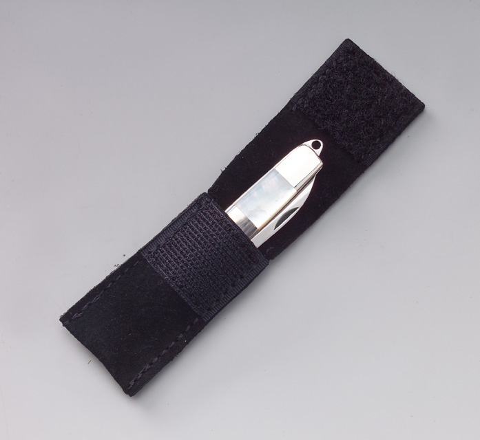 Il fodero è dato da una striscia di pelle scamosciata nera ripiegata parzialmente su se stessa e cucita. La rimanente viene a sua volta ripiegata per chiudere il fodero. La chiusura è affidata a due pezzi di velcro.