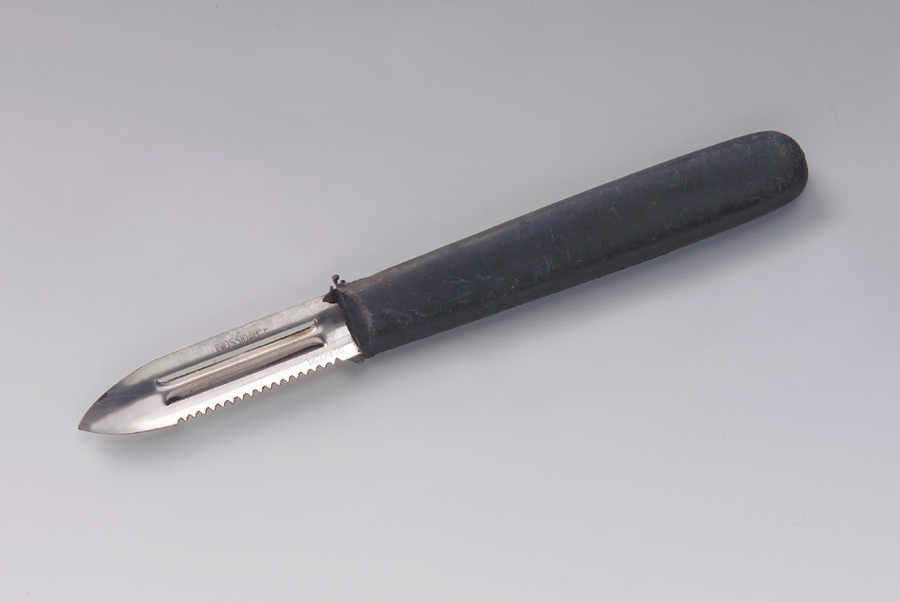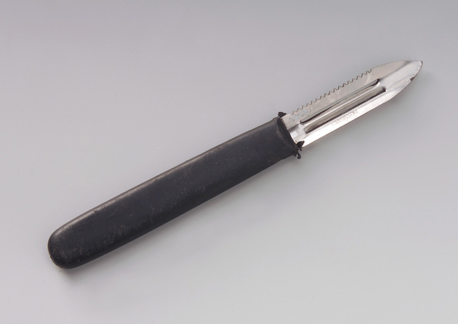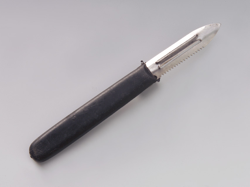 La lama semicircolare ha la punta a trinciante e uno dei lati con tagliente tutto seghettato tranne che sulla punta. Ai lati della mezzeria della lama vi sono due tagli lungo i quali la lamina è stata ripiegata e si è ottenuto un tagliente liscio per rimuovere la buccia delle patate. Il manico in plastica dal profilo rettangolare con i lati lunghi convessi. Le facce del manico hanno un avvallamento per facilitare l'impugnatura.