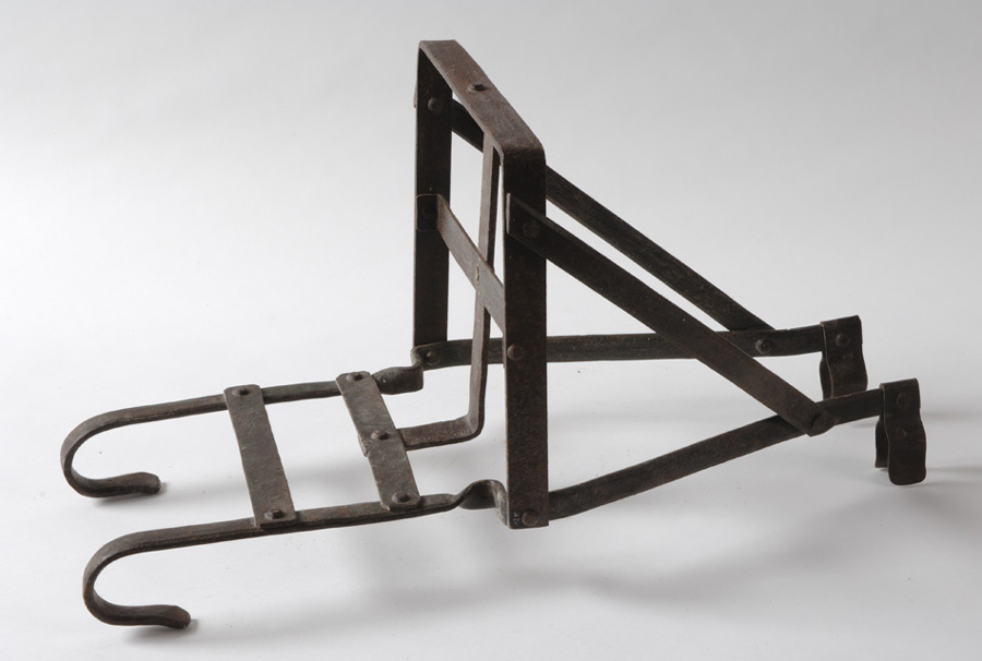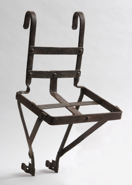Struttura di ferro con una base di appoggio a forma rettangolare; superiormente due ganci ricurvi permettono l'ancoraggio al manubrio mentre inferiormente due fascette di ferro fresate si innestano sulla forcella del telaio.