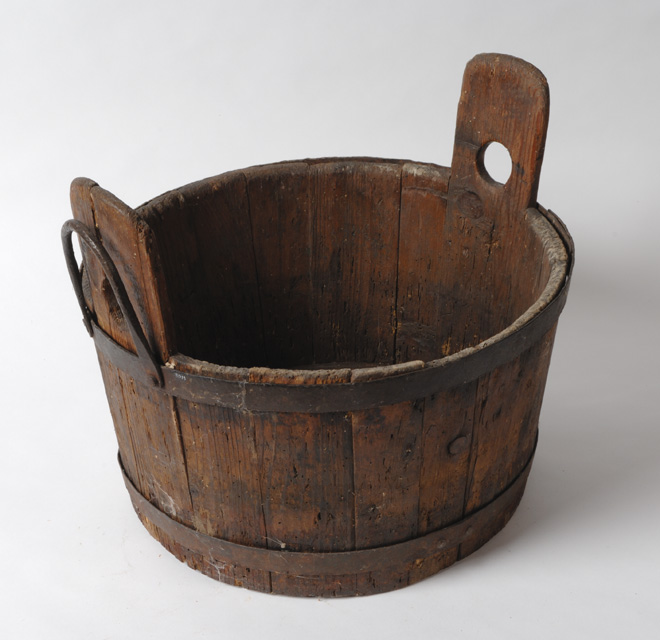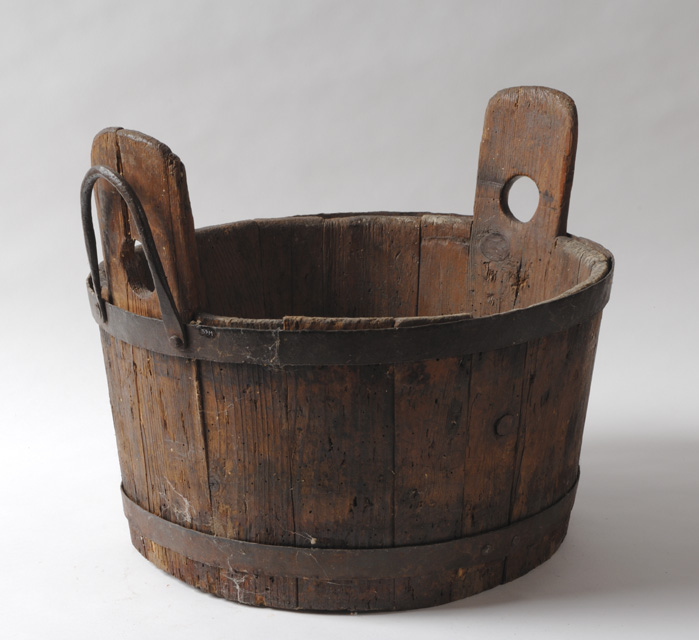 Tinozza a forma di tronco di cono rovesciato, di legno a doghe, di cui due sporgenti dalla bocca e munite di fori in cui far passare un bastone o una corda per rendere più agevole il trasporto. Le doghe sono tenute assieme da due fasce di ferro poste alla base e al margine della bocca. Sulla fascia superiore è presente una maniglia di ferro in corrispondenza di una delle due doghe forate.