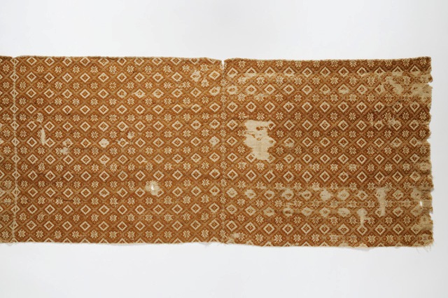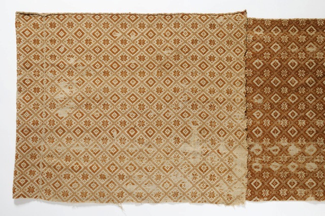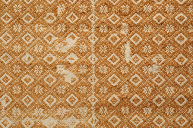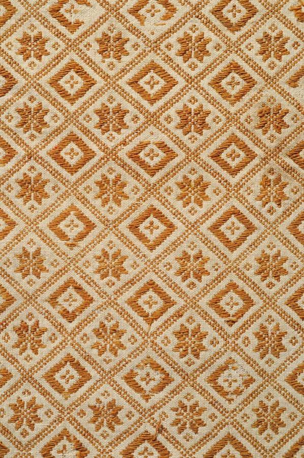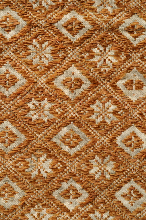Frammento di coperta rettangolare, con motivo decorativo a maglie quadrate disposte obliquamente contenenti a losanghe che si ripetono a scacchiera alternate ad una stella. Il disegno è realizzato in ocra su fondo bianco. La coperta è composta da tre pezze (ciascuna di cm 73,8) cucite insieme a punto filza. Solamente un bordo lungo è ripiegato (cm 0.8) e cucito con un sottopunto in filato di lana chiaro.