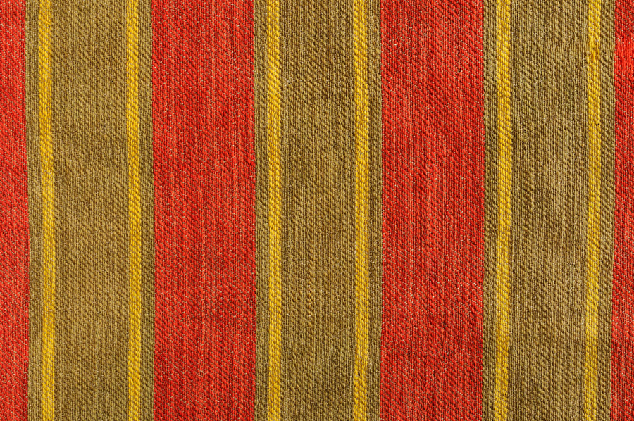 Coperta rettangolare, a righe verticali di colore rosso abbinate a due sottili righe gialle che si alternano regolarmente a righe verdi. Il manufatto è composto da quattro teli (cm 70), accostati e cuciti a punto filza con filo marrone. I lati corti sono ripiegati (cm 0.8) e cuciti a sottopunto.