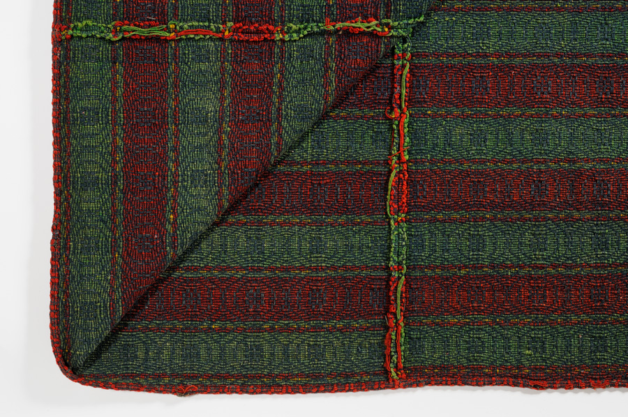 Coperta rettangolare con fondo a righe orizzontali di colore rosso e verde, abbinate a due righe più sottili degli stessi colori, inframezzate da un colpo di trama giallo. Il decoro, ottenuto per effetto delle trame slegate, è dato da teorie orizzontali parallele di orbicoli ovaliformi contenenti una rosetta stilizzata. Il manufatto è composto da tre teli accostati ed uniti con una filza in lana marron-nocciola; i due profili corti sono ripiegati (cm 0.8) e cuciti a sottopunto.