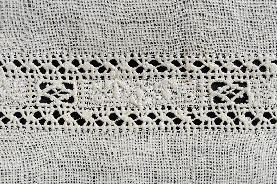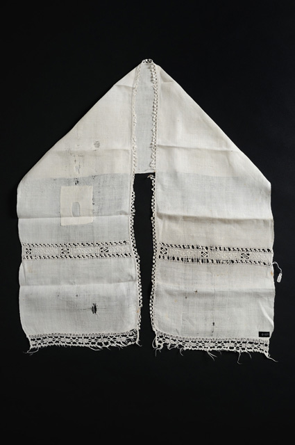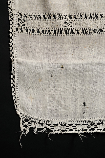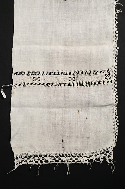 Fazzoletto lungo e stretto, confezionato in tela di lino ripiegato lungo tutto il profilo (cm 0.2) e cucito a sottopunto. Due larghi tramezzi, posti a 23 cm dall’estremità e contenuti entro una fila di gigliuccio, presentano motivi romboidali, ottenuti ad ago, alternati ad un ricamo a punto piatto con gigli stilizzati. Merletti a fuselli di diverse altezze e decori profilato tre lati: quello posto sui due lati corti presenta un motivo a rosette (cm 4), mentre quello su un lato lungo una semplice smerlatura (cm 1).