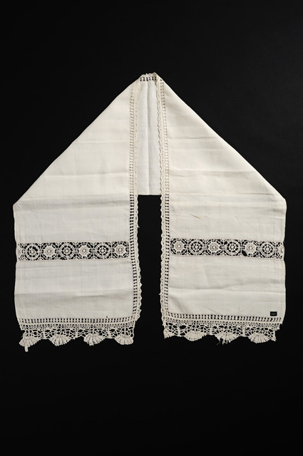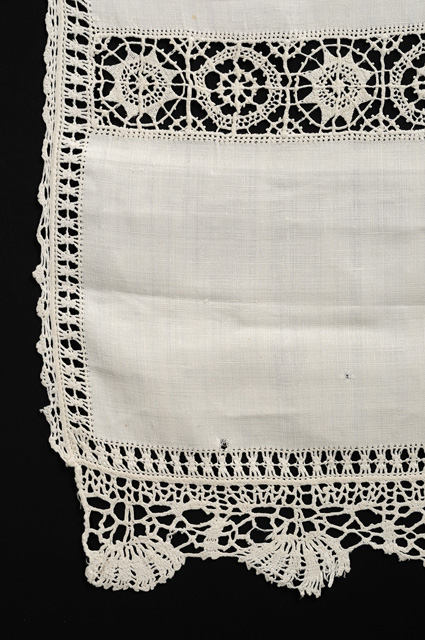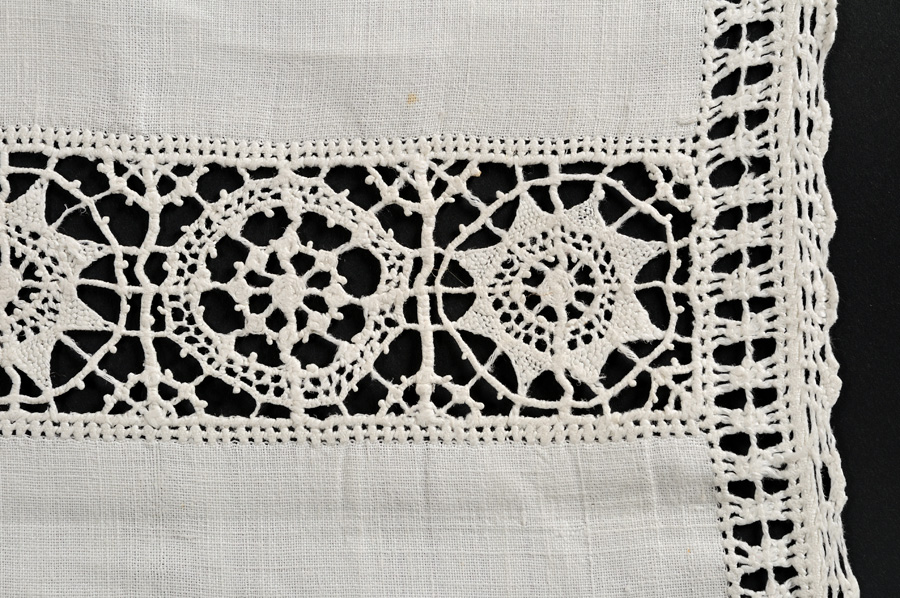 Fazzoletto in tela di lino di forma lunga e stretta, ornato lungo tre lati a punto reticello a motivi geometrici traforati ( cm 1.5); due tramezzi trasversali sono ricamati a reticello a 24 cm dal profilo, con rosoni stellati alternati ad altri fioriti. Merletti a fuselli ornano i due lati corti e un profilo lungo: il primo con motivo a ventaglio su larghe maglie a rete, l’altro di minori dimensioni presenta una minuta smerlatura.