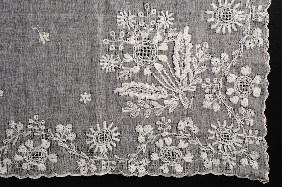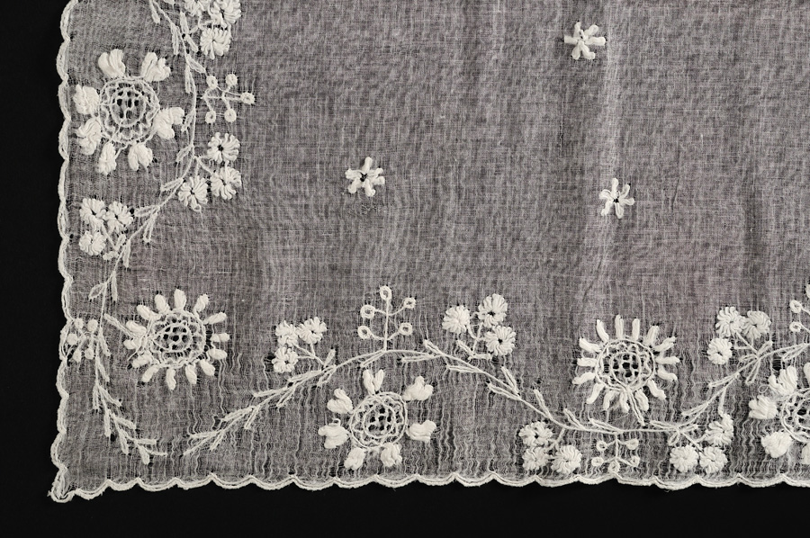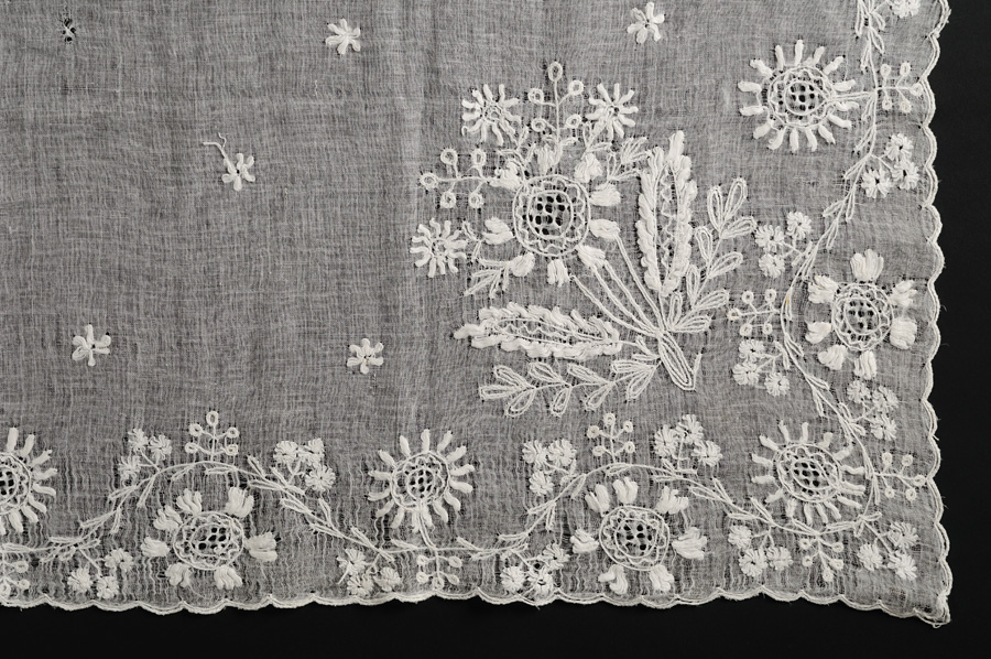 Il fazzoletto, di forma quasi quadrata, è confezionato con tela di lino molto sottile, pressochè trasparente. Il decoro è dato da un motivo floreale, ricamato su un angolo di una faccia e su quello opposto dell’altra, in modo da essere visibile correttamente una volta sormontato sulla testa: lungo tutto il profilo si snoda un tralcio sinuoso, da cui hanno origine sottili steli con foglioline, piccole margherite e bacche, nelle anse si alternano invece grandi fiori con corolla centrale traforata; sui due angoli si sviluppa un mazzo stilizzato con una corolla centrale, abbinata a tre piccole margherite e tre rametti di bacche, arricchita alla base da due larghe foglie polilobate e altre più piccole a spiga. Teorie sfalsate di piccole margherite sono disposte su tutto il campo centrale.