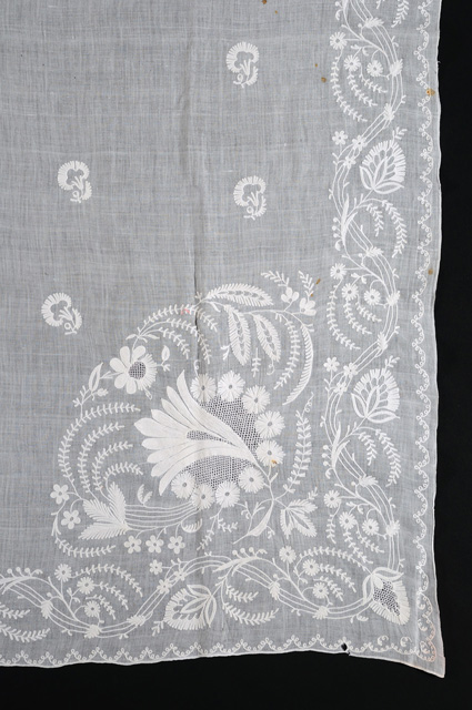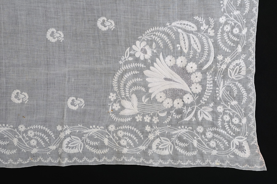 Il fazzoletto, di forma quasi quadrata, è confezionato con tela di lino molto sottile, pressochè trasparente. Il decoro è dato da un motivo floreale, ricamato su un angolo di una faccia e su quello opposto dell’altra, in modo da essere visibile correttamente una volta sormontato sulla testa; due lati del profilo sono ripiegati (cm 0.3) e cuciti a sottopunto, mentre due lati presentano la cimosa a vista. Tutto il profilo è percorso da un sottile festone smerlato, abbinato ad una larga cornice composta da tre steli ondulati, con minute foglie, che s’intrecciano a tre margherite, roselline selvatiche, e grandi fiori con corolle sbocciate, abbinati a foglie a spiga e bacche. I due angoli sono interamente riempiti da un grande tulipano, posto su una corolla traforata a nido d’ape, perlinata di piccole margherite. Tutt’attorno si snoda un festone simile alla cornice di profilatura. Piccoli fiori polilobati, disposti su due file oblique, sfalsate, occupano il campo centrale.