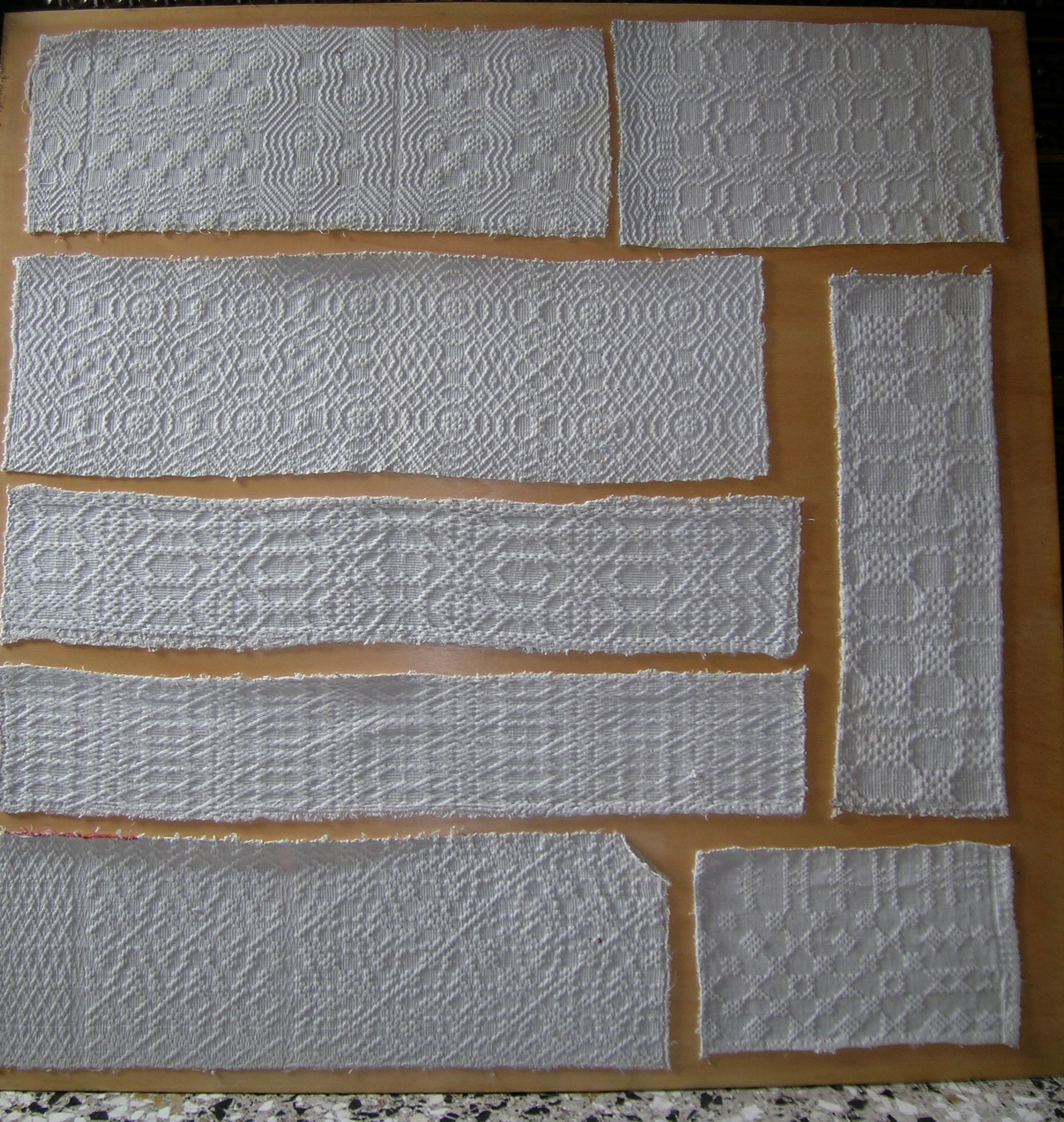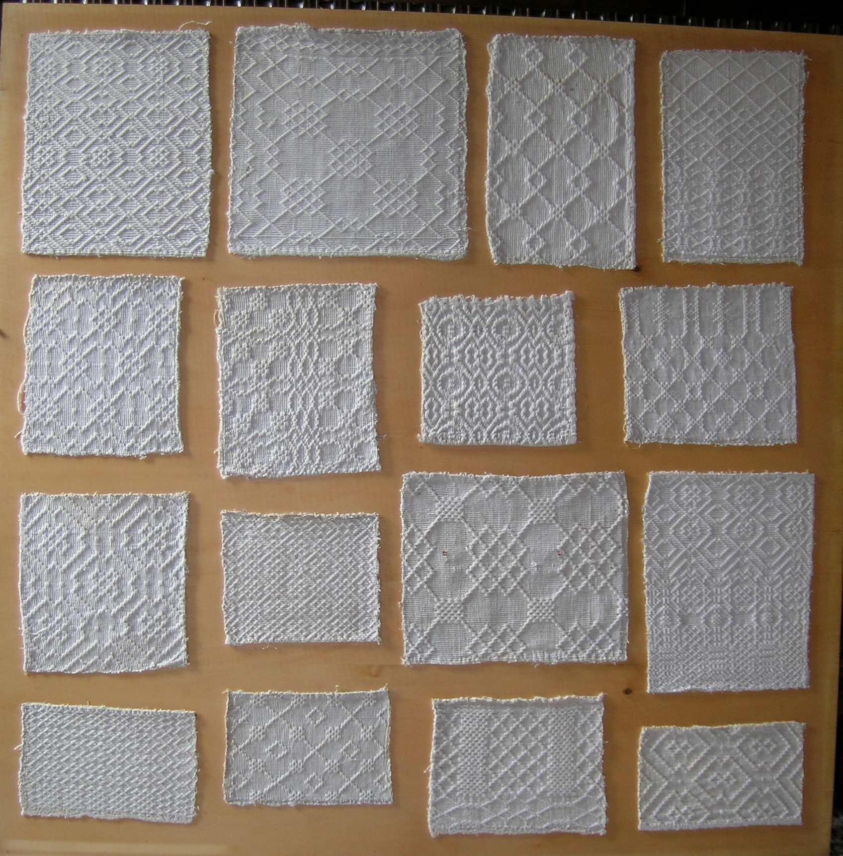 I pannelli in legno, chiusi da vetro, raccolgono quarantasei campioni di varie dimensioni realizzati a piccolo operato (con l’ausilio di un telaio a licci, adatto alla realizzazione di tessuti ad armatura tela/tela liserè o diagonale), in lana bianca o colorata con decori come losanghe, rettangoli, quadrati e piccoli motivi geometrici che rappresentano i modelli dei tessuti destinati soprattutto al corredo per la casa, quali coperte o asciugamani e tovaglie.