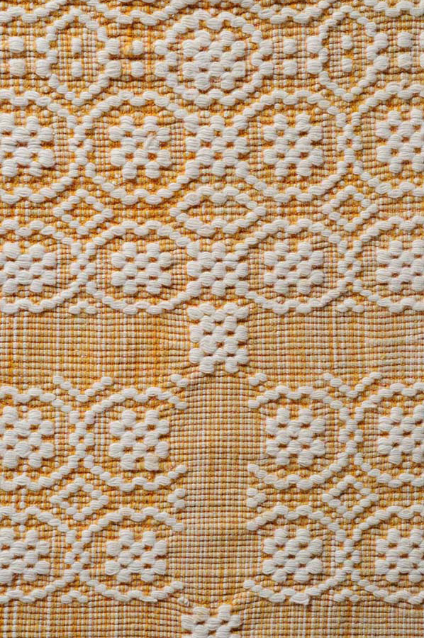 Campione di tessuto di forma rettangolare, con motivo decorativo dato da teorie orizzontali di orbicoli ovaliformi contenenti un bottone simile a un fiore stilizzato con otto piccoli petali; nelle anse create tra una teoria e l’altra vi è una piccola losanga di raccordo. Il decoro è in bianco su fondo giallo-rosaceo.