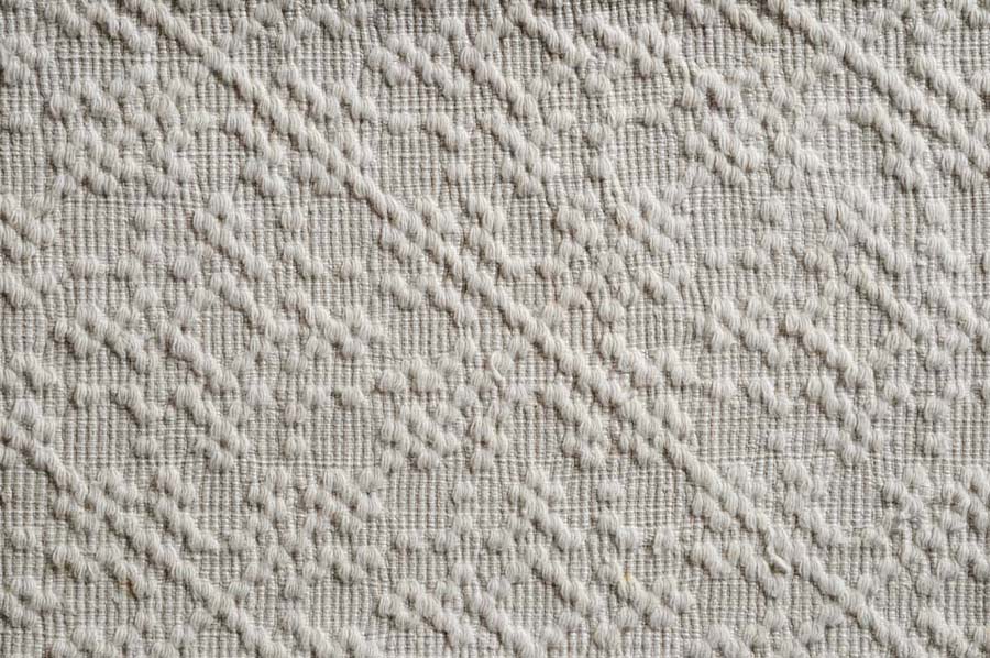 Campione di tessuto rettangolare bianco con due motivi decorativi geometrici a rilievo, dati dall’effetto di slegatura delle trame a dritto. Il primo decoro è dato da sequenze verticali sfalsate di rombi inscritti in maglie romboidali con piccoli fiori sui vertici laterali, abbinati a nastri ondulati, che seguono con anse pronunciate l’andamento delle teorie. Il secondo decoro presenta teorie orizzontali sfalsate di maglie quadrate disposte obliquamente, ciascuna contenente una croce con rombo centrale e fastigi sui bracci; il profilo di ogni quadrato presenta su tutti i lati due piccoli fiori stilizzati.