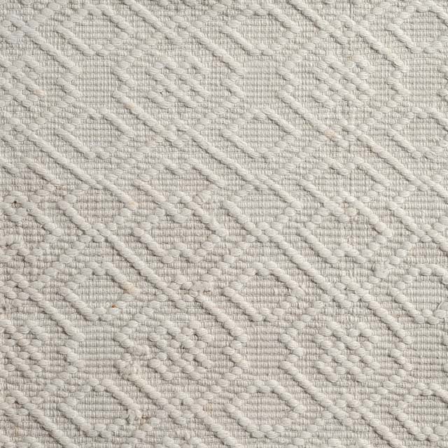 Campione di tessuto rettangolare bianco con motivo decorativo geometrico a rilievo, dato dall’effetto di slegatura delle trame a dritto. Il decoro è dato da teorie verticali a maglie ottagonali irregolari, con inserite piccole croci alternate ad elementi geometrici intersecati; negli spazi tra una sequenza verticale e l’altra, si dispongono piccole figure geometriche poligonali.