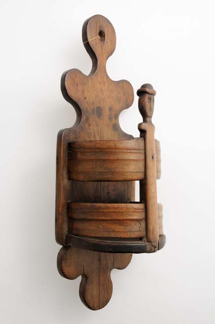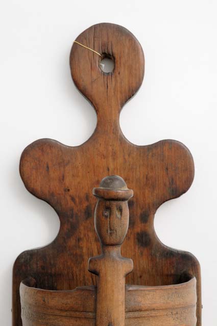Portaposate a base semicircolare con parete formata da due assicelle curvate, trattenute da un passante di legno terminante con un volto umano stilizzato con cappello. Tavoletta dorsale sagomata.