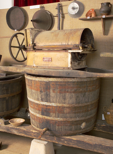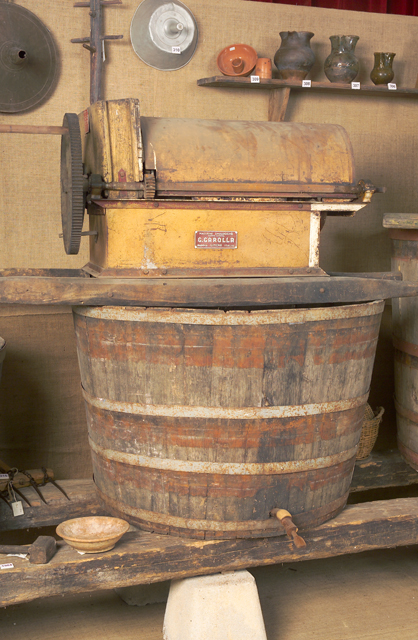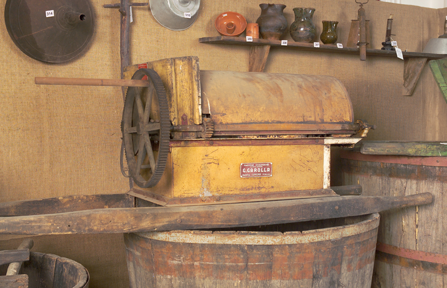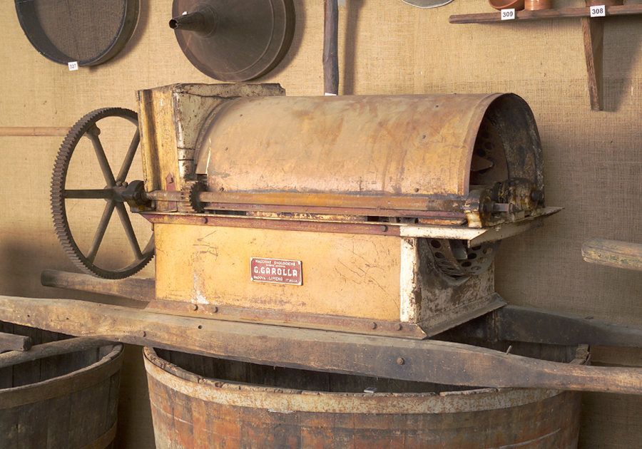 Questi attrezzi vengono motorizzati verso la metà del 1900 ed è in questo momento, probabilmente, che viene applicata la targhetta sulla bocca di alimentazione. E' presente una trasmissione a cinghie trapezoidali.