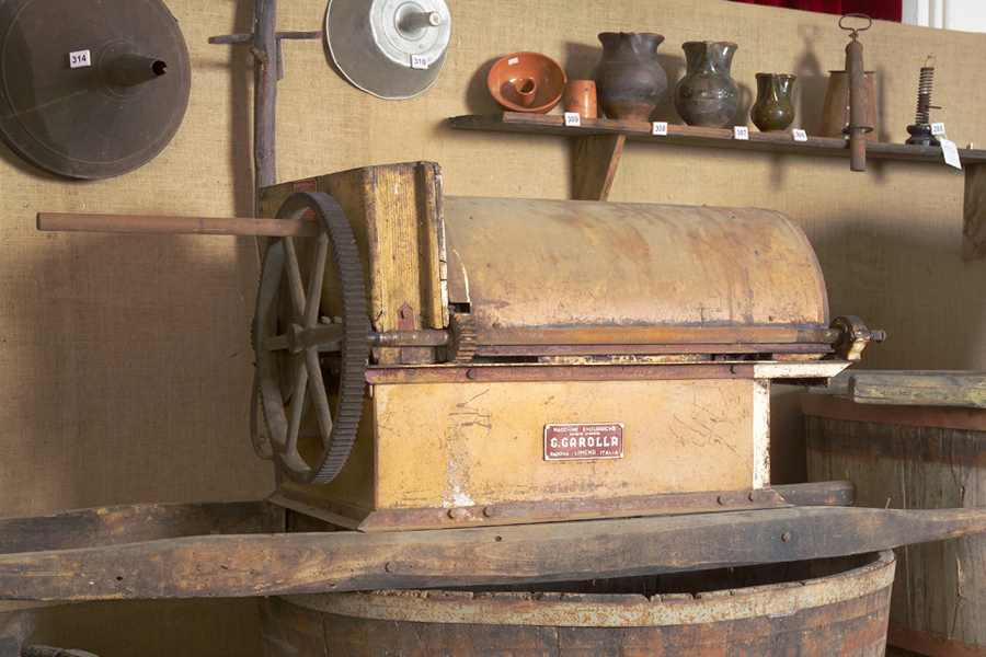 targhetta alluminio rivettata su bocca alimentazio: S.A. GIUSEPPE GAROLLA - LIMENA (PADOVA) / MACCHINE ENOLOGICHE / PIGIATRICE DIRASPATRICE CENTRIFUGA / Tipo DO Modello OB / Numero 4141 Anno 1952/ Potenza richiesta HP 0,5 N° giri battitore al 1'800 / Avvertenze: Lavare giornalmente con acqua tutta la macchina. A fine stagione pulire, ingrassare e se necessario riverniciare le parti che lo richiedessero. Lubrificare e verificare spesso i cuscinetti.