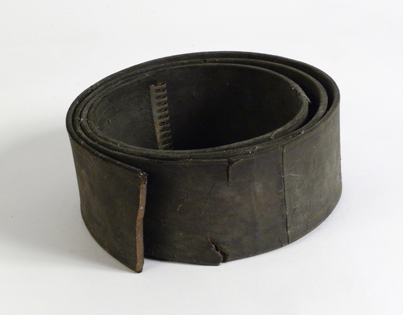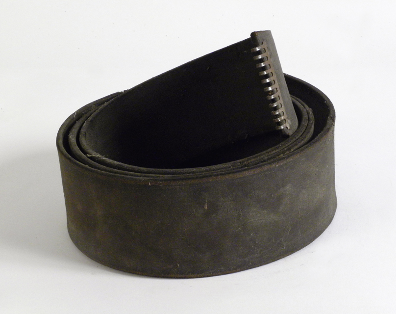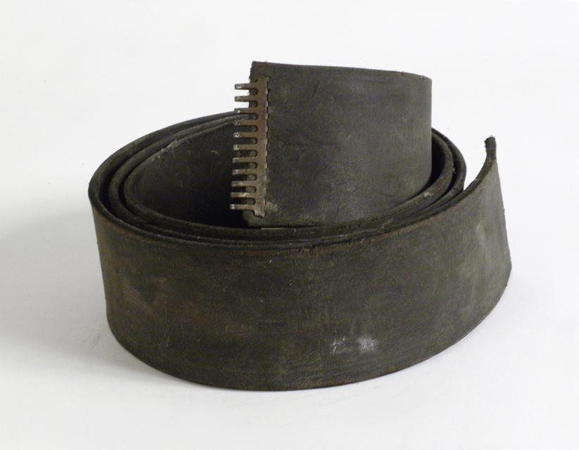 Striscia di cuoio; ad un'estremità presenta una sorta di cerniera di metallo.