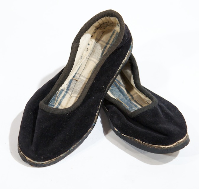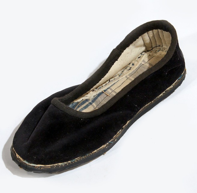 Scarpettina bassa di panno senza tacco. La tomaia in velluto nero è cucito alla suola, realizzata con un copertone opportunamente sagomato, con un filo di spago sottile e resistente. La fodera interna della pianta è realizzata con una stoffa quadrettata (blu e panna) attraversata da alcuni punti di imbastitura.