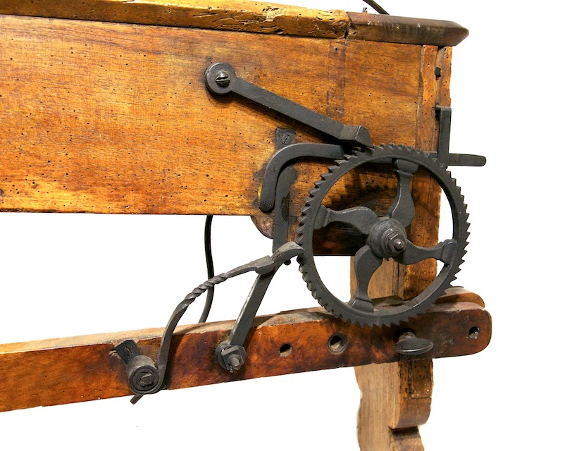 Su tre gambe, due anteriori leggermente arcuate e collegate da una traversa ed una unica posteriore modanata, è fissata una sorta di cassone con il lato anteriore aperto. Nella parte frontale una lama con maniglia è fissata mediante bracci mobili ad un meccanismo "a scatto" che regola l'avanzamento delle foglie pressate all'interno del contenitore.
