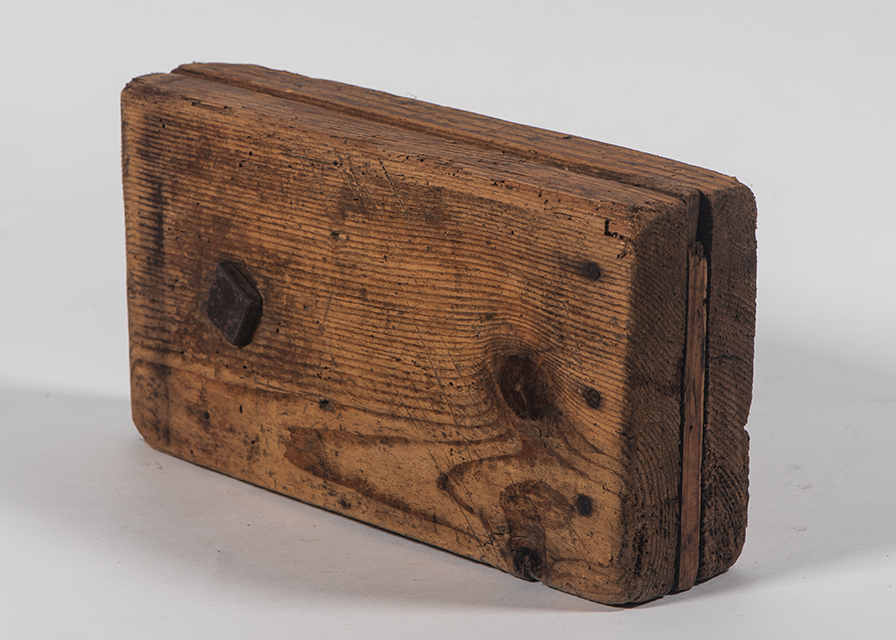 Questo contromorsa presenta il corpo rettangolare e lo spessore in legno di abete. La vite, con testa quadra, e il dado ad alette (detto galletto) sono in acciaio.