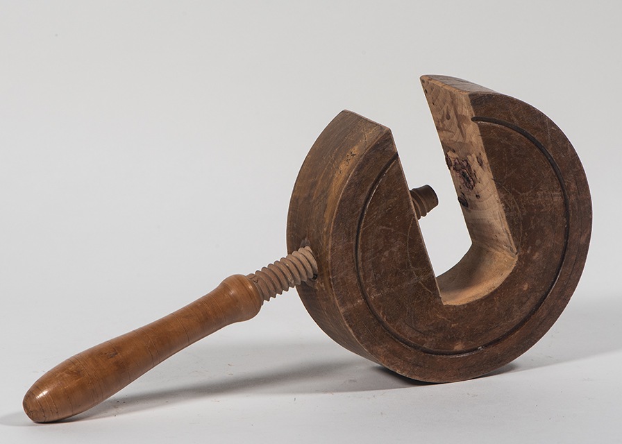 Questo morsetto presenta il corpo circolare e la vite filettata in legni diversi e verniciati (non all'interno). Il corpo sembra ricavato da un tondo di legno da cui è stata asportata una parte che va dal bordo fin oltre il centro. Sono presenti dei filetti decorativi sul corpo e sulla presa.