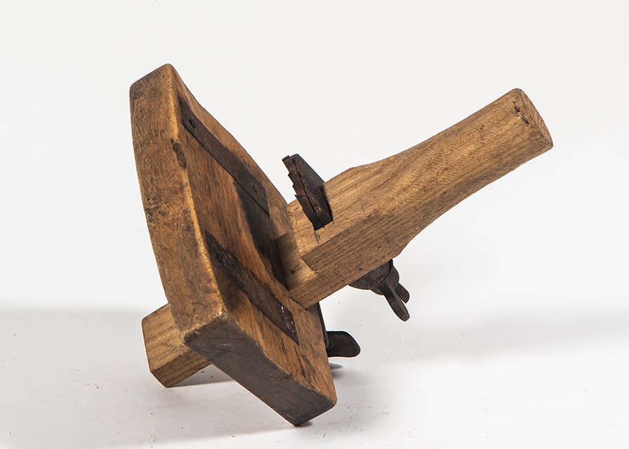 Questo caprugginatoio, detto anche incastro per fondi, presenta il corpo troncoconico (o riscontro) e il manico in legno. Ai lati del riscontro sono presenti due barre in metallo trattenute con tre viti che servono per proteggere il legno dall'usura. L'asta portautensile, o manico, è stato rifatto e presenta tracce di matita a indicare che il lavoro è stato fatto in una bottega artigianale. Le parti in acciaio sono arrugginite. La distanza tra la lama ed il corpo, viene fissata bloccando il pezzo con la vite a galletto. A seconda del lavoro, si possono cambiare le lame: l'attrezzo è corredato di 4 lame di ricambio (inv. 505, scheda 19239).