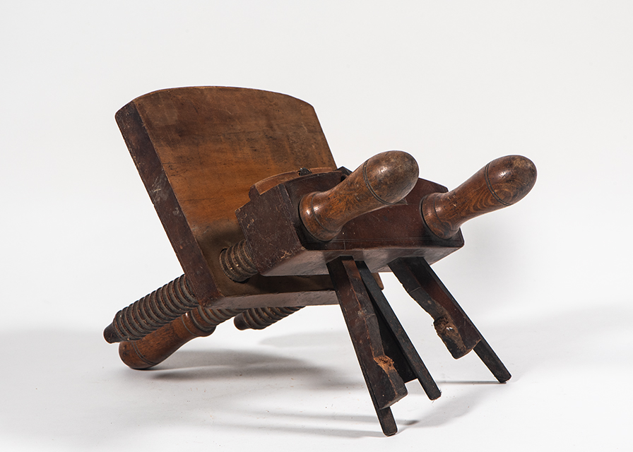 Questo caprugginatoio, detto anche incastro per fondi a regolatore, presenta il corpo o riscontro, il portautensili e le tre viti in legno. Il corpo è di forma troncoconica. Le lame, in acciaio, vengono regolate grazie ai cunei. Per regolare, invece, la distanza tra il portautensili a tavoletta (parte con le lame) ed il riscontro, prima si agisce sulle due viti e poi si regola la controvite. Il legno è forse in melo o pero, comunque un legno a grana fine che permetta la filettatura.