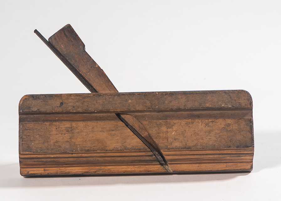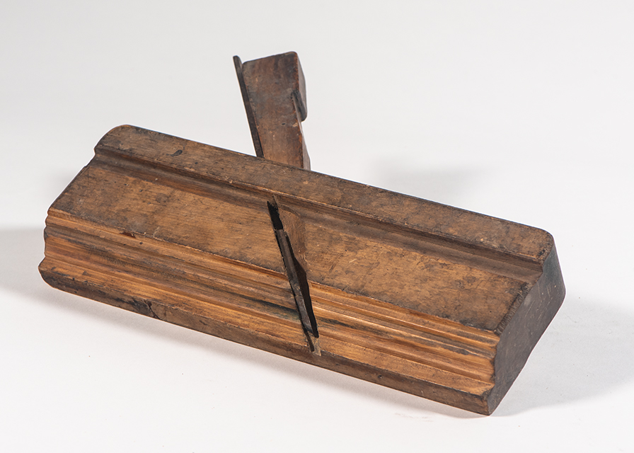Questa pialla, probabilmente una pialla da gola, ha un corpo in legno a forma di parallelepipedo e una lama d'acciaio, modanata e arrugginita. La parte superiore del corpo presenta gli angoli smussati, mentre la faccia laterale dove è presente il foro di uscita dei trucioli, presenta della modanature. Il cuneo di fissaggio in legno, o zeppa, e la lama, o coltello, bloccata dal cuneo, hanno andamento trasversale da sinistra a destra. La parte inferiore, detta suola, presenta delle scanalature, che saranno quelle conferite dalla lama al legno da lavorare. Presenta anche una sponda posteriore che funge da guida e permette di far scorrere la pialla lungo l'intera lunghezza del legno da lavorare, mantenendo un punto di riferimento.