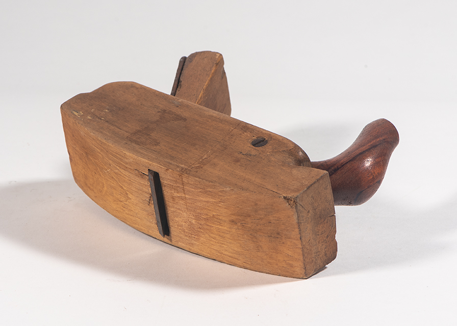 Questa pialla ha un corpo (ceppo) e un cuneo in legno. Il corpo è caratterizzato dalla curvatura convessa della suola, adatta a lavorare elementi curvilinei. Nella parte anteriore del ceppo è fissato un manico o manubrio sporgente e tornito, detto anche #corno#, in legno diverso. In seguito ad una rottura del corpo il manico è fissato con due viti laterali al corpo, che fungono anche da serraggio del corpo stesso, fessurato. Nella parte centrale del ceppo è presente un foro da cui escono i trucioli asportati del legno. Verso la parte posteriore due scanalature ospitano rispettivamente il cuneo di fissaggio, o zeppa, e la lama, o coltello, in acciaio arrugginito, leggermente curva. Mancano controlama e vite. Sul retro della lama è presente il marchio punzonato JOH. WEISS/ SOHN. WIEN scritto in verticale in cartiglio con al centro il simbolo del morsetto e sopra l'aquila bicipite dell'Austria. La parte posteriore del corpo presenta una sporgenza curvilinea per le battute del martello.