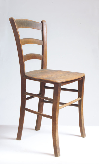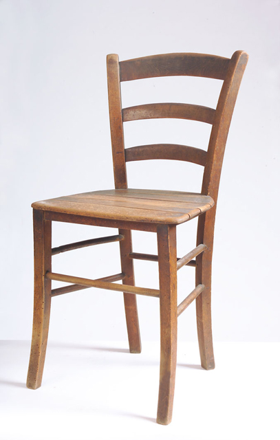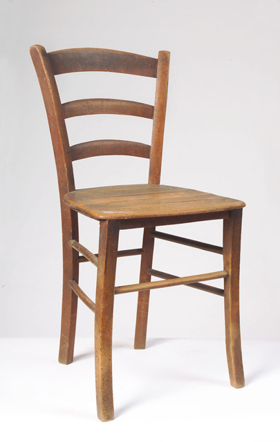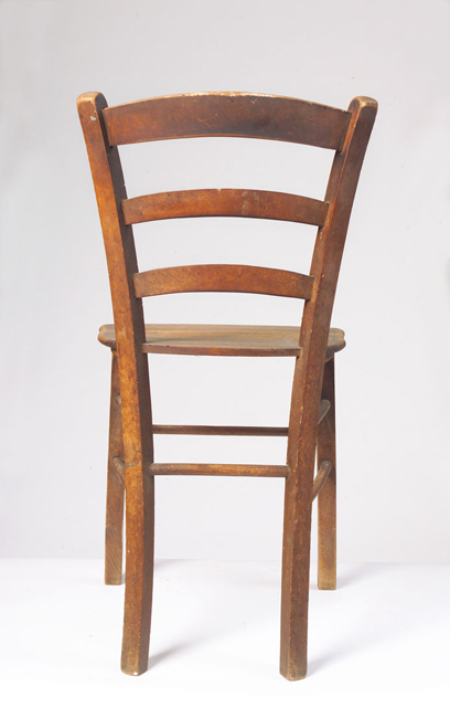Sedia in legno verniciato, con mordente; sedile a tavoletta, costituito dalla giustapposizione di cinque assi sagomati; schienale costituito da tre traversi a sezione rettangolare, lievemente curvati verso l'alto e con traverso superiore di maggiori dimensioni. Gambe a sezione quadrata, lievemente curvate e rastremate in prossimità degli appoggi, collegate da traverso unico a sezione circolare anteriormente e posteriormente, doppio traverso a sezione circolare lateralmente.
